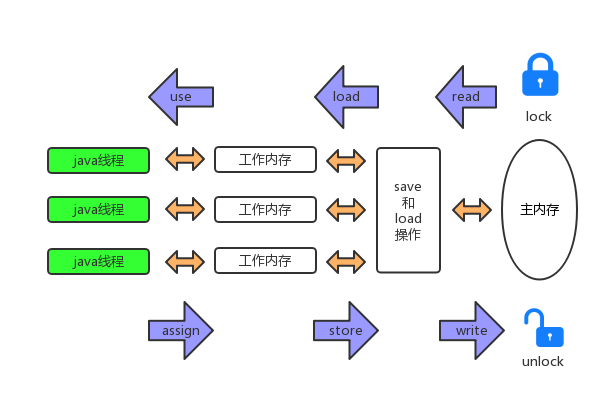 可以看到,图中一共有三个区域,线程执行区、工作内存、主内存,其中线程执行区和工作内存是线程独享的,也就是线程隔离的,而主内存也就是我们常说的堆里面存储对象实例数据所占用的内存,是线程共享的。JVM定义了8种内存间的交互操作,分别如下: