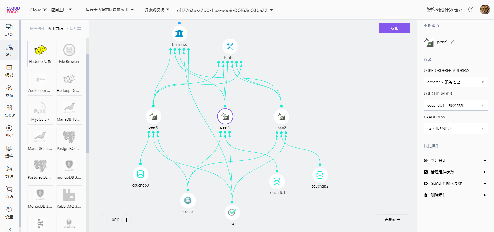 借鉴工业领域模块化组装的概念,以图形化通过拖拉拽边缘模块、云侧模块的能力,快速构建物联网业务。 设计好的架构图以自研蓝图规范格式存储,可以一键式交付到任意端侧和云侧环境。用来组装应用的模块来自于企业内部或是社区内开发者贡献于应用商店的内容,开发者随时可以设计、分享新的模块。